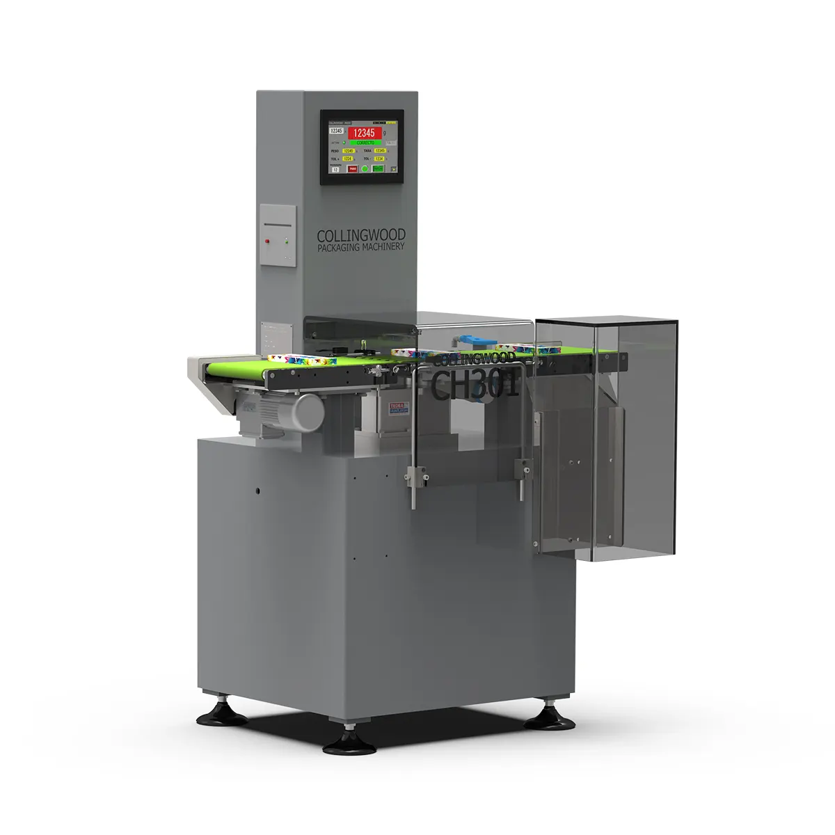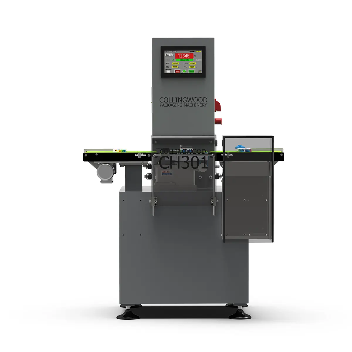 La controladora de peso dinámico CH301 dispone de tres cintas de transporte y por tamaño permite la verificación y control de pesos que no sobrepasen los 100 g.